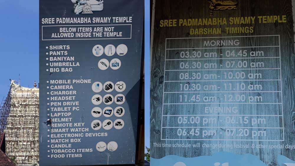1 - Temple de PADMANABHA SWAMI Le temple de PADMANABHA SWAMI dépend toujours de l'autorité du Maharadja de Travancore, ce qui ne résoud pas le problème du partage de l'énorme trésor qui a été découvert dans ses fondements. Le bâtiment principal date de la fin du XVIIe siècle : en 1686, un incendie détruit le corps principal mais épargne les fondations qui remontent au moins au XIIe siècle. La reconstruction est achevée en 1729. Trésor du temple En 2010, la Cour suprême de l'Inde reçoit une plainte d'un ancien employé du temple devenu avocat, et ordonne un inventaire des biens du temple, étant donné la mauvaise gestion du lieu, lequel est sous la responsabilité de l'Ettara Yogam (King and Council of Eight), composé de six membres, assistés par les Ettuveetil Pillamar (Lords of the Eight Houses). Toutes les décisions sont prises en accord avec le raja de Travancore : en principe, les biens du temple sont sous la garde de la famille royale de Travancore et de son dernier représentant, Moolam Thirunal Rama Varma. Depuis 1971, l'Union indienne ne reconnaît aucun pouvoir politique aux rois locaux, cependant, les propriétés attachées aux dieux peuvent être confiées à la garde d'une personne morale. Après une bataille juridique, le temple est exploré par les autorités fédérales au début de l'année 2011. Le 27 juin 2011, un trésor estimé entre 14 et 15 milliards d'euros est découvert par les autorités fédérales dans cinq des huit chambres souterraines (kallaras) du temple. Le trésor est constitué de colliers, pierres précieuses, statues ou encore de pièces en or, objets qui formeraient l'ensemble des offrandes dédiées au dieu Vishnou et qui furent rassemblées ici au fil des siècles. Une des chambres, la « B », n'a pas été encore ouverte ; elle est scellée avec une porte de fer portant un motif de cobra, ce qui, selon la croyance populaire, est signe de malheur. Les chambres G et H n'ont pas été ouvertes non plus. Le temple est ensuite placé sous surveillance : des caméras et des détecteurs, mais aussi près de 200 gardes armés veillent en permanence. En 2014, la Cour suprême indienne retire au maharaja de Travancore la gouvernance de la fondation gérant les affaires du temple, qui passe sous l'autorité du district de Thiruvananthapuram et du gouvernement du Kerala, sous la surveillance d'un membre de l'Indian Administrative Service et d'un conseiller du temple. Ce trésor composé d'objets en or et de gemmes serait actuellement le plus important au monde jamais découvert. L'existence de caves est connue depuis au moins 1933 : l'écrivaine britannique Emily Gilchrist Hatch, publiait dans Travancore: A Guide Book for the Visitor (Oxford University Press) une anecdote à leur propos. VISITE On peut en tant qu'étranger visiter le temple, mais il y a de très grosses contraintes, et on ne peut pas aller partout. La visite risque donc d'être décevante, maisp ar contre les extérieurs valent la peine.